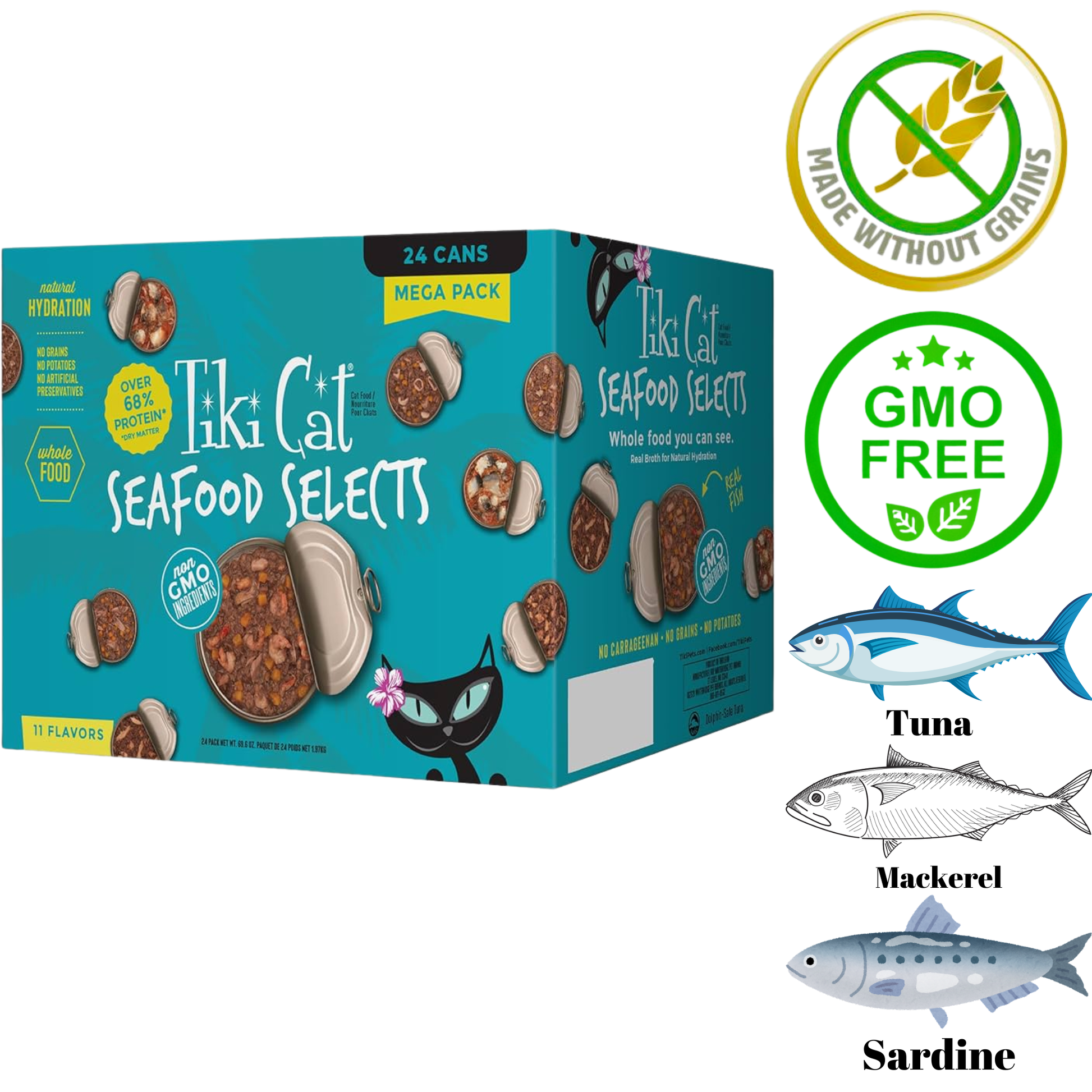 The Tiki Cat Seafood Selects Variety Pack is a high-protein, high-moisture wet cat food bundle designed to delight fish-loving felines of all life stages. Featuring real flaked fish as the first ingredients and delivered in a variety pack format, it offers a wide range of seafood flavours to keep meal times interesting. This grain-free and potato-free diet uses 100 % non-GMO ingredients and is formulated to be complete and balanced for cats of all breeds and ages.