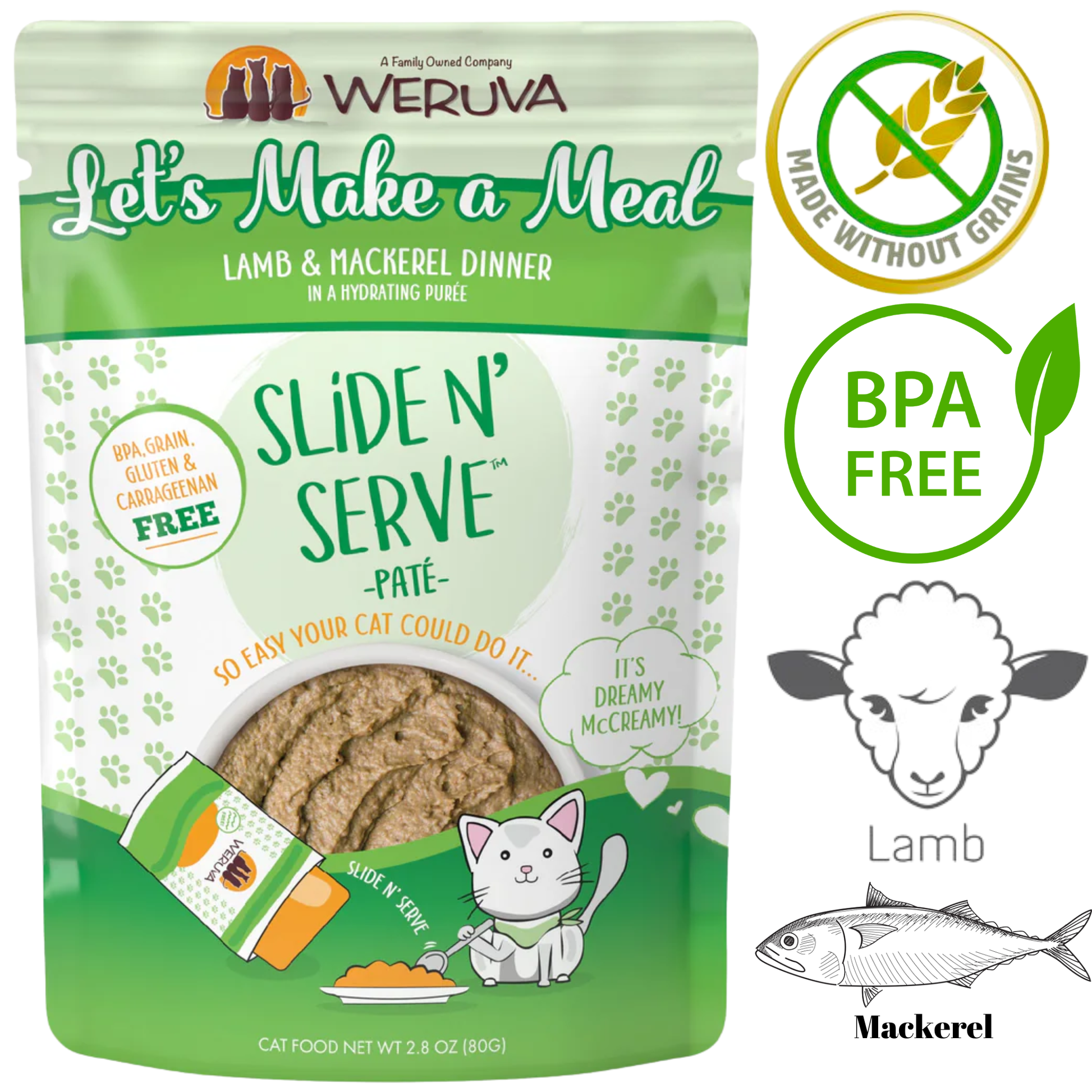 Weruva – Let’s Make A Meal Wet Cat Food Pouch is a grain-free, high-moisture pâté made with quality protein like grass-fed lamb and wild-caught mackerel. The smooth “Slide N’ Serve” pouch format makes serving simple and mess-free. This wet food offers complete, balanced nutrition and hydration for adult cats.