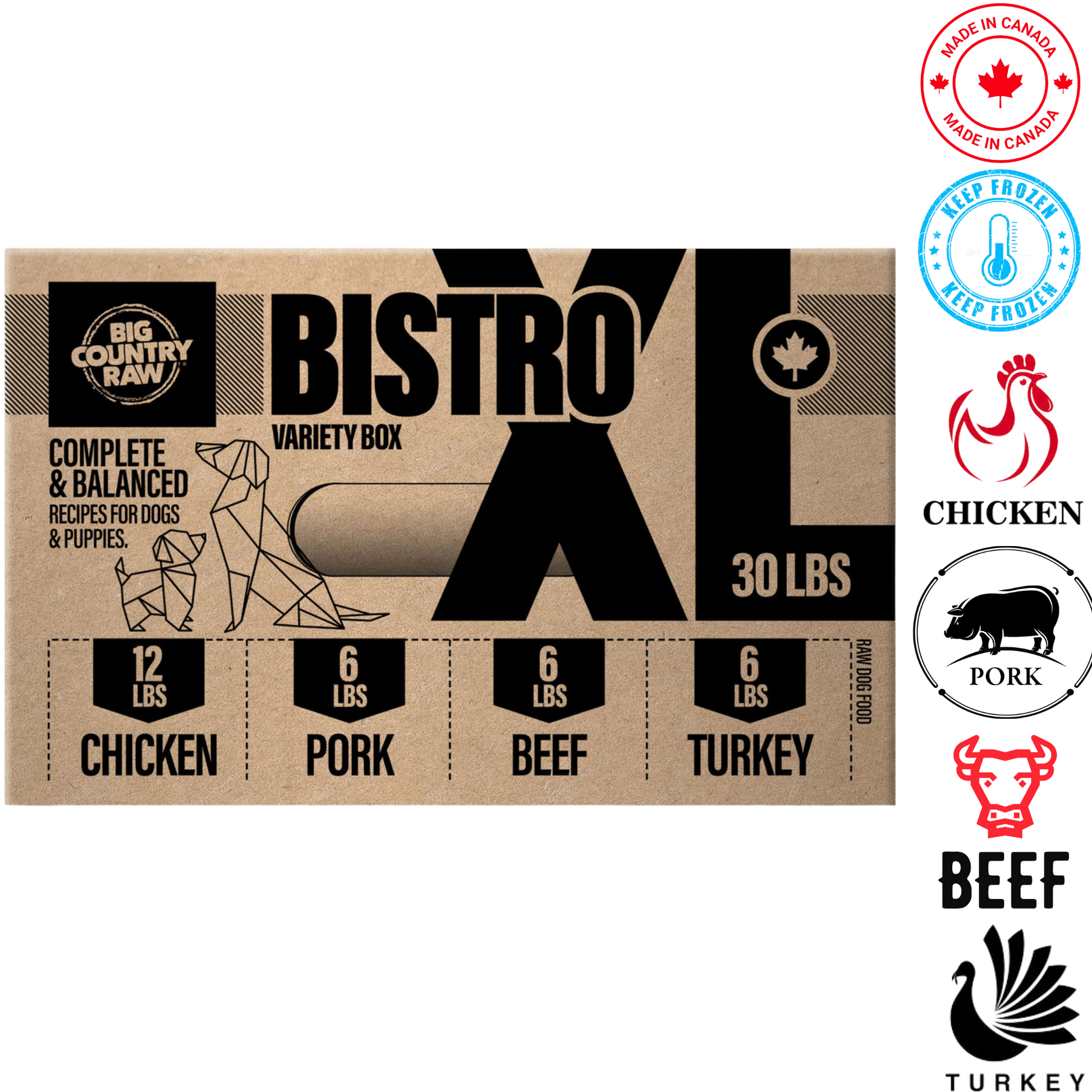 Big Country Raw XL Bistro 30磅装是终极的营养均衡盒装,提供四种优质蛋白质,让您的用餐时光既精彩刺激又营养均衡。这款包装非常适合养多只狗狗的家庭,内含12磅XL鸡肉、6磅XL火鸡肉、6磅XL牛肉和6磅XL猪肉——为您的爱犬提供它们喜爱的蛋白质轮换。