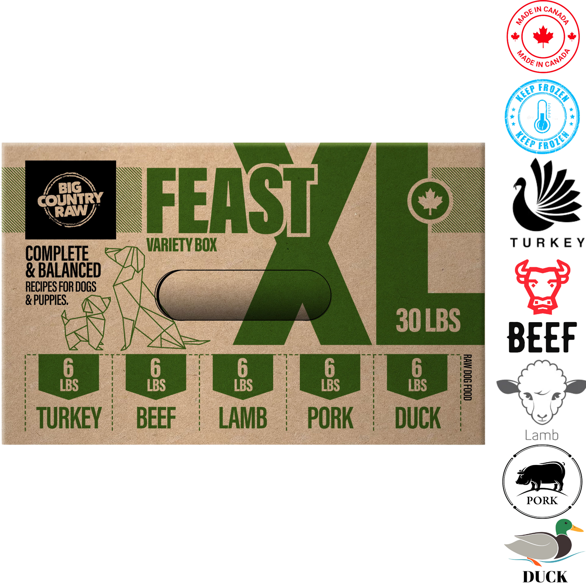 Big Country Raw XL Feast 是终极无鸡肉什锦餐盒,非常适合喜欢蛋白质多样化或对家禽过敏的狗狗。此包装包含五份优质 XL 配方——XL 牛肉、XL 羊肉、XL 火鸡肉、XL 猪肉和 XL 鸭肉,每份 6 磅——总共提供 30 磅营养丰富的餐食,让您的爱犬饮食既刺激又均衡。