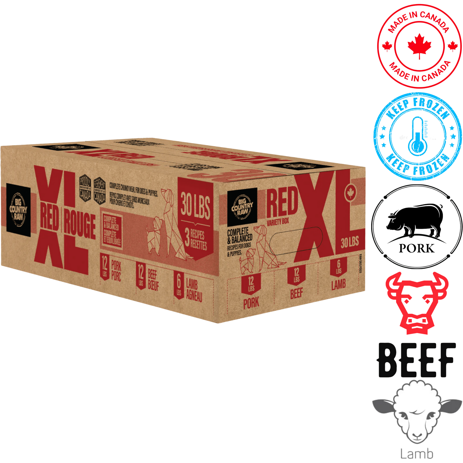 购买 Big Country Raw XL Red,尊享优质红肉什锦套装,满足各年龄段爱肉爱犬的需求。作为我们 XL 系列的最新成员,此套装包含 12 磅 XL 牛肉、12 磅 XL 猪肉和 6 磅 XL 羊肉,非常适合对家禽过敏或喜爱浓郁肉味的狗狗。