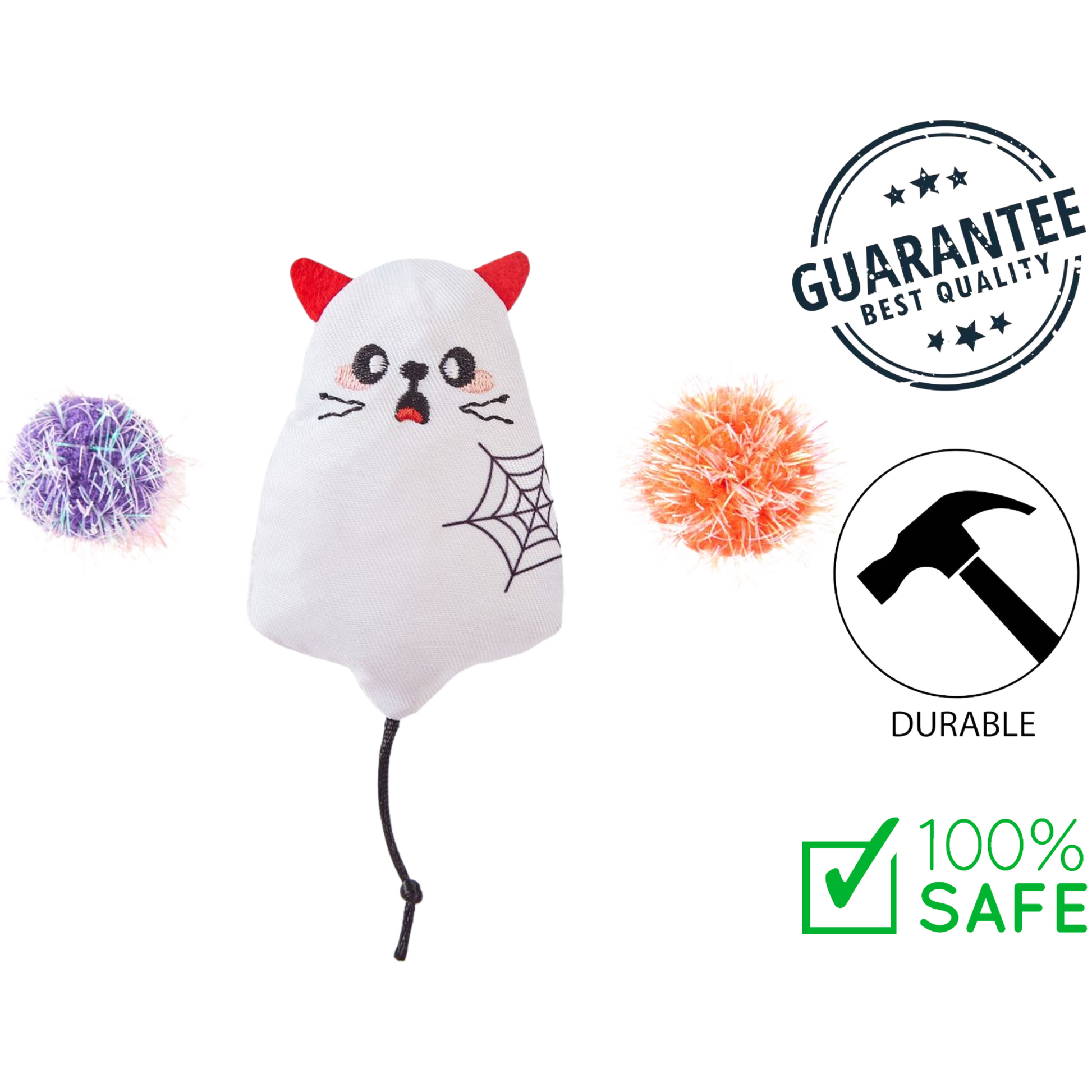 The HugSmart Spooky Cats Meow Buddies Ghost Kitty Cat Toy set brings spooky fun to feline playtime. Featuring three soft ghost-themed toys infused with catnip, they’re designed to captivate your cat’s curiosity and encourage energetic play. The lightweight design makes them easy to bat, toss, and chase, providing hours of entertainment and stimulation.